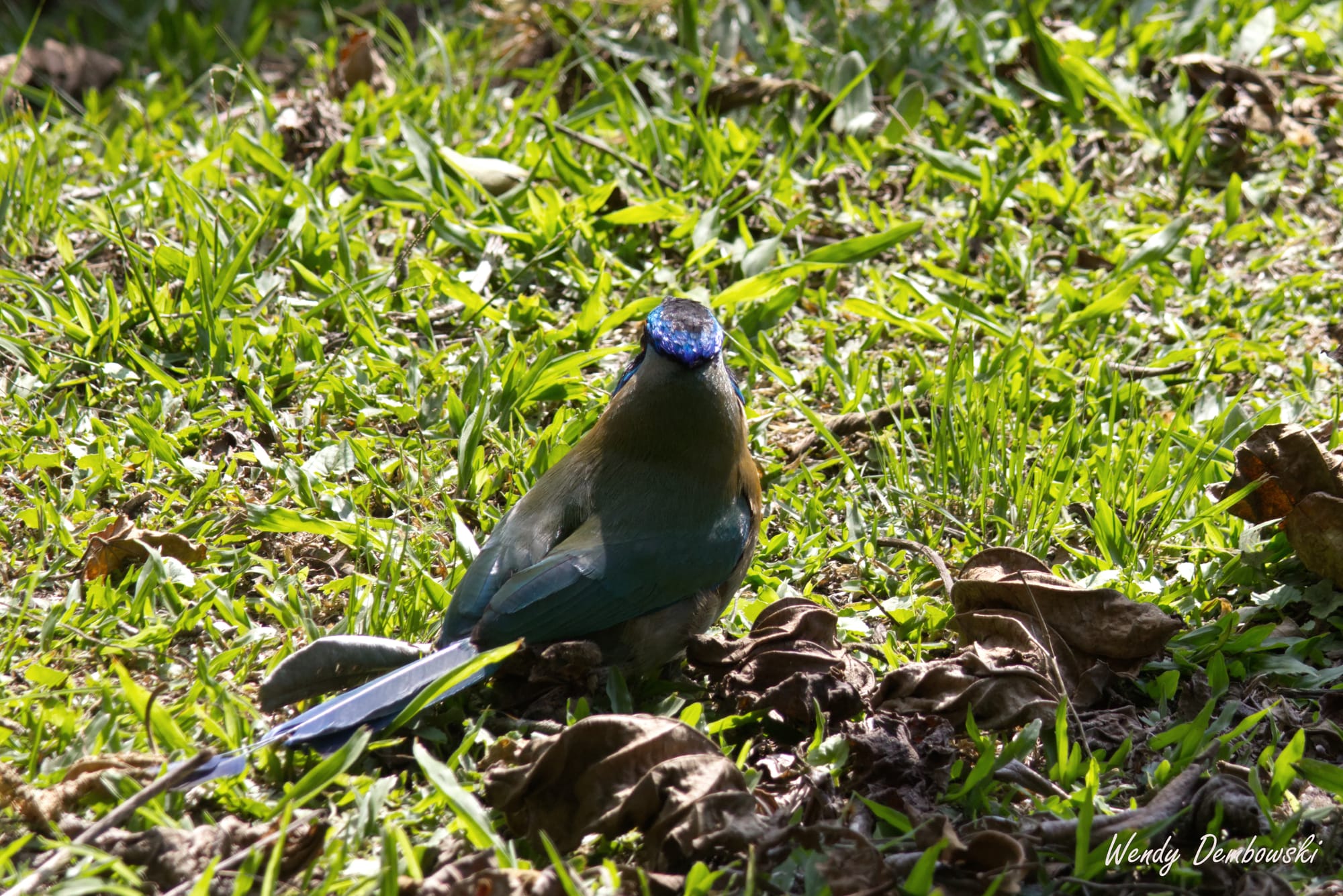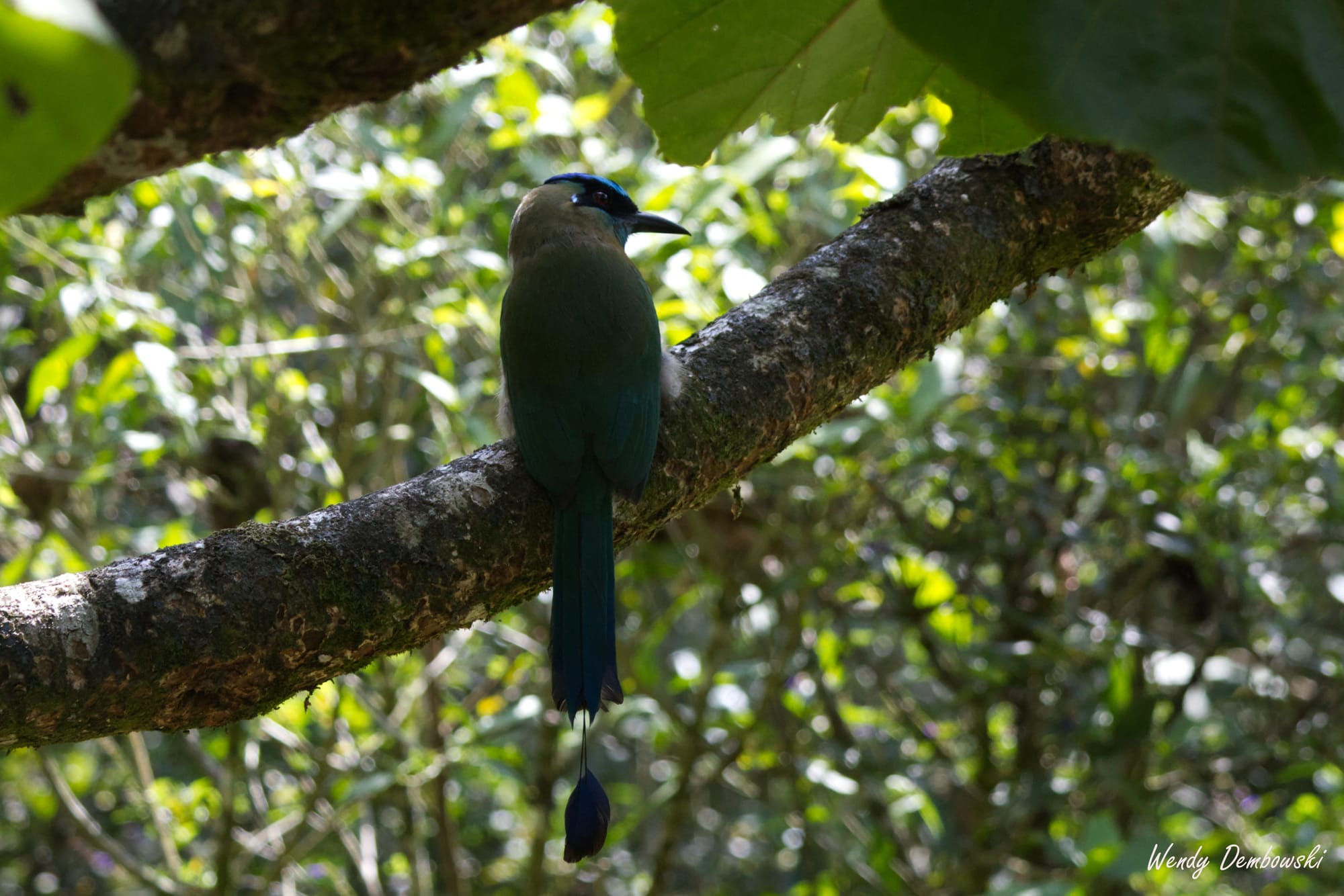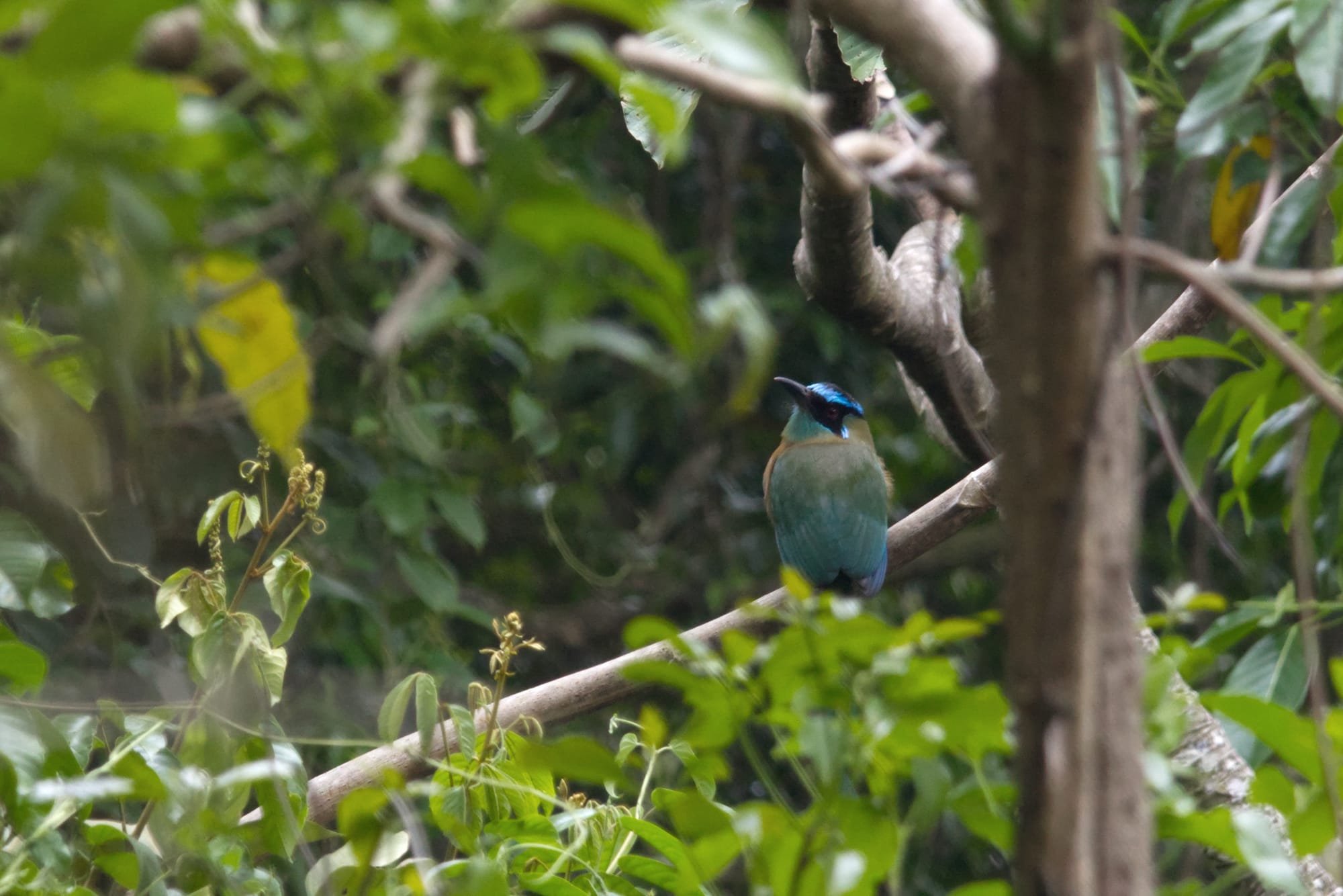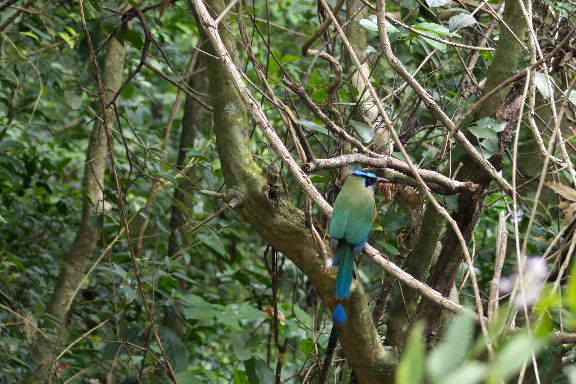 A small waterfall along the trailA log falls across the stream just off trail with dense vegetation all aroundOur first look at a Lesson's Motmot! They are such pretty birds!The Lesson's Motmot adjusted position to face us, and contemplate.