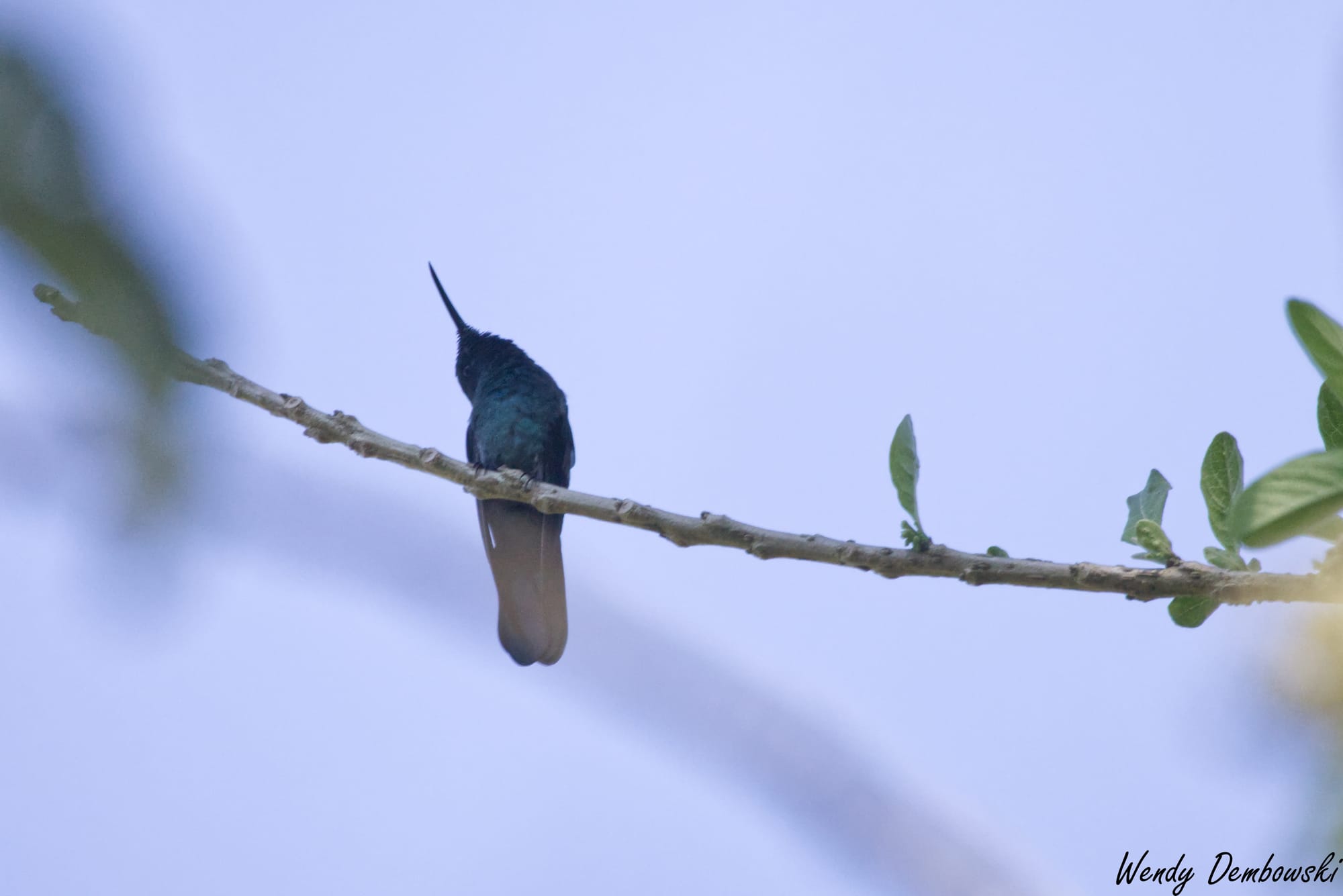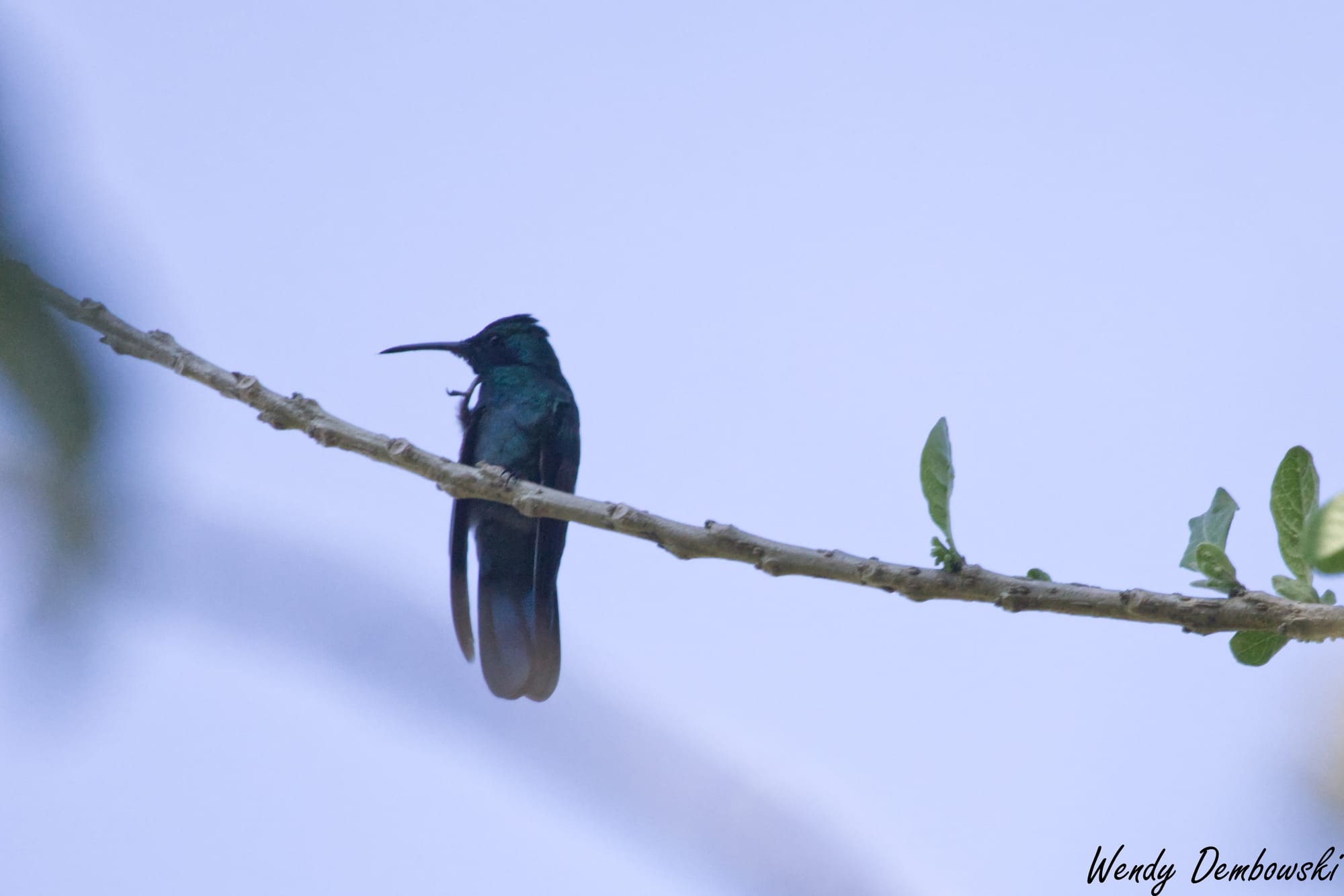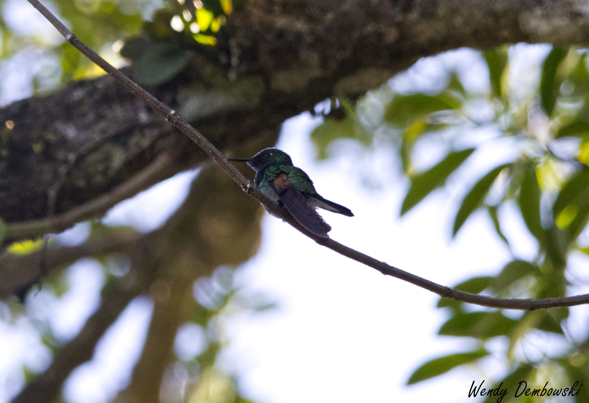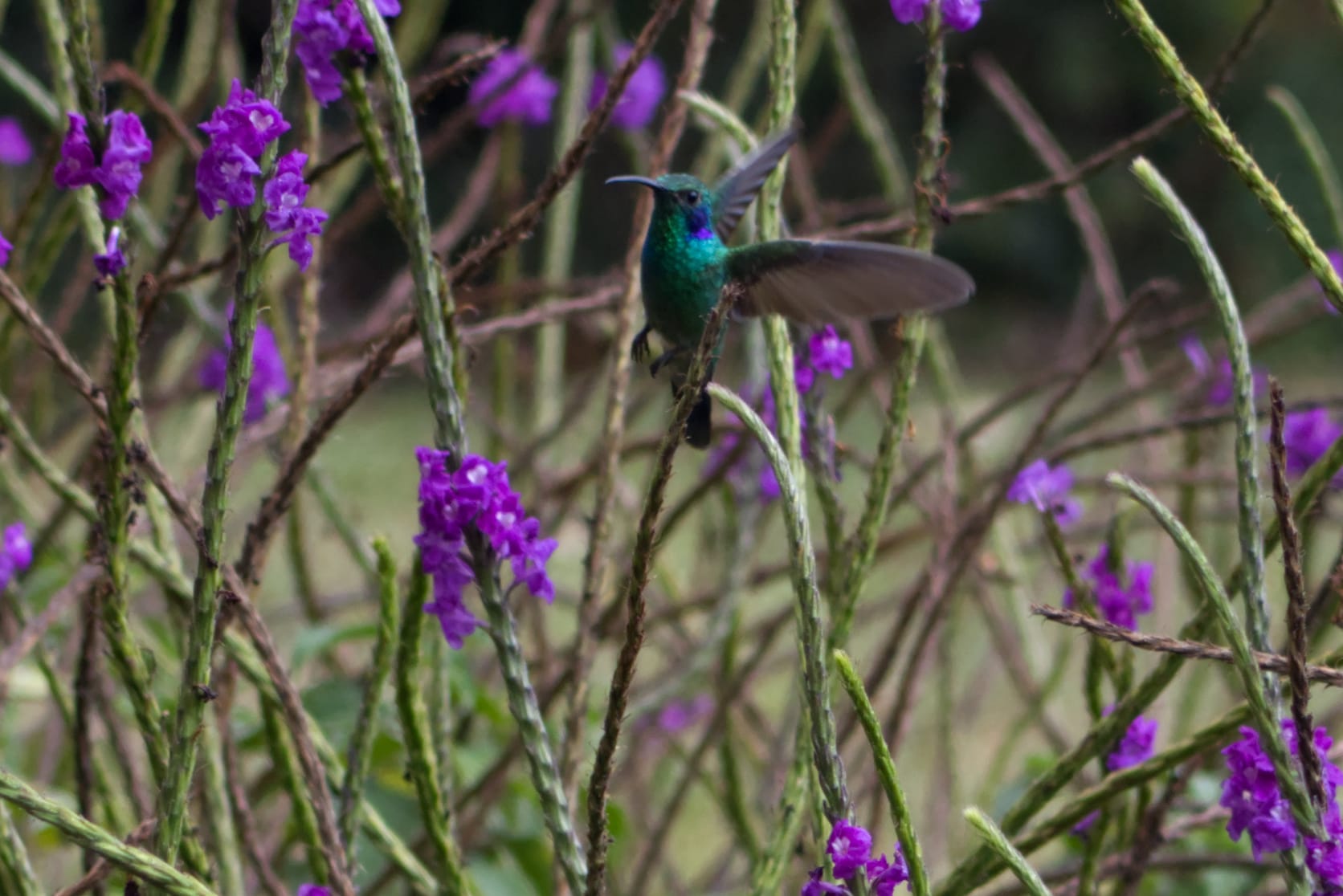 There was a tree amongst these bushes with the purple flowers that the hummingbirds loved. Occasionally they would stop to rest on the tree branches. I stayed with one hummingbird during this resting time. The following is a tiny Violetear Hummingbird story in 5 photos.