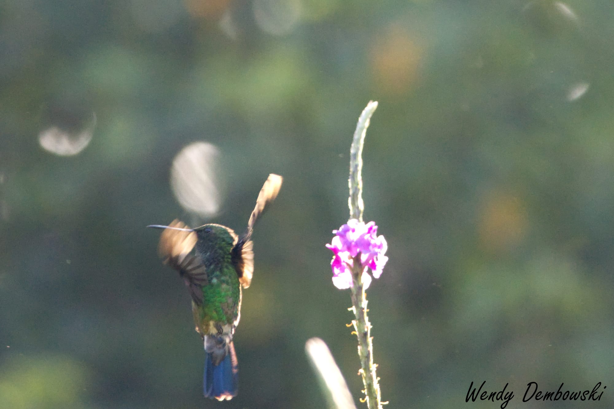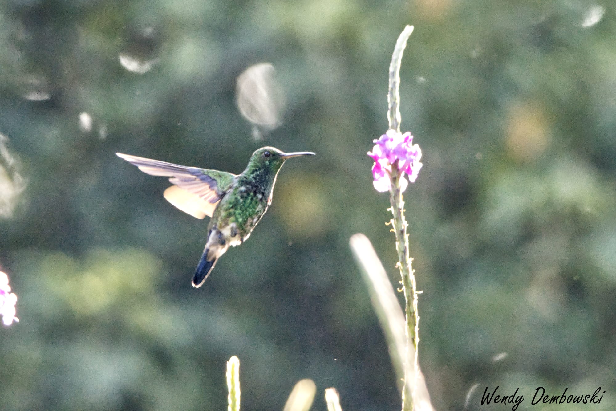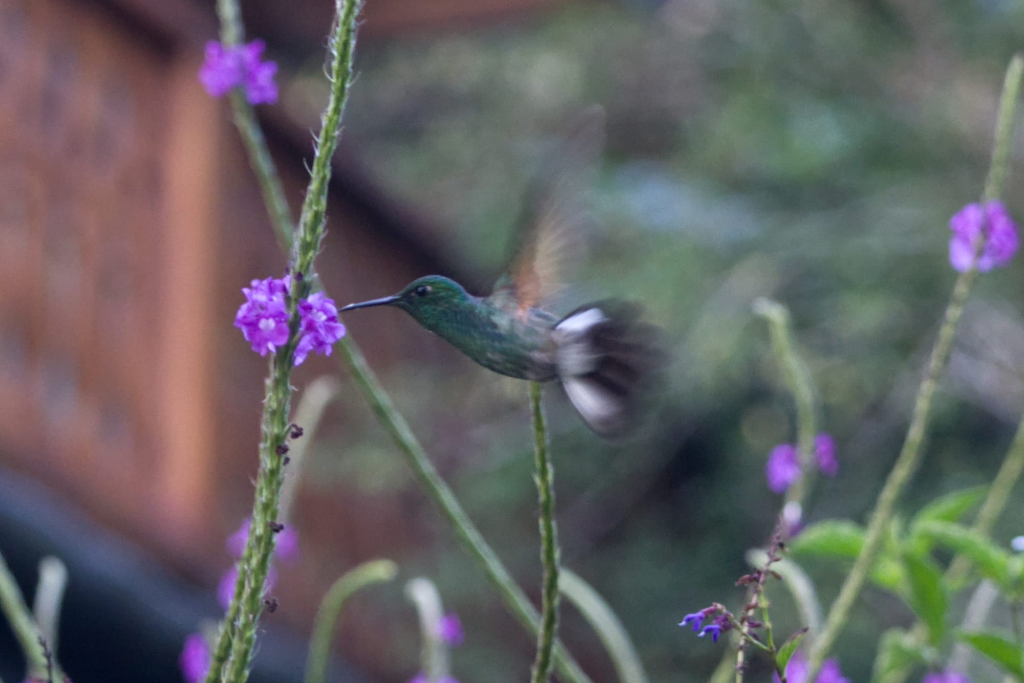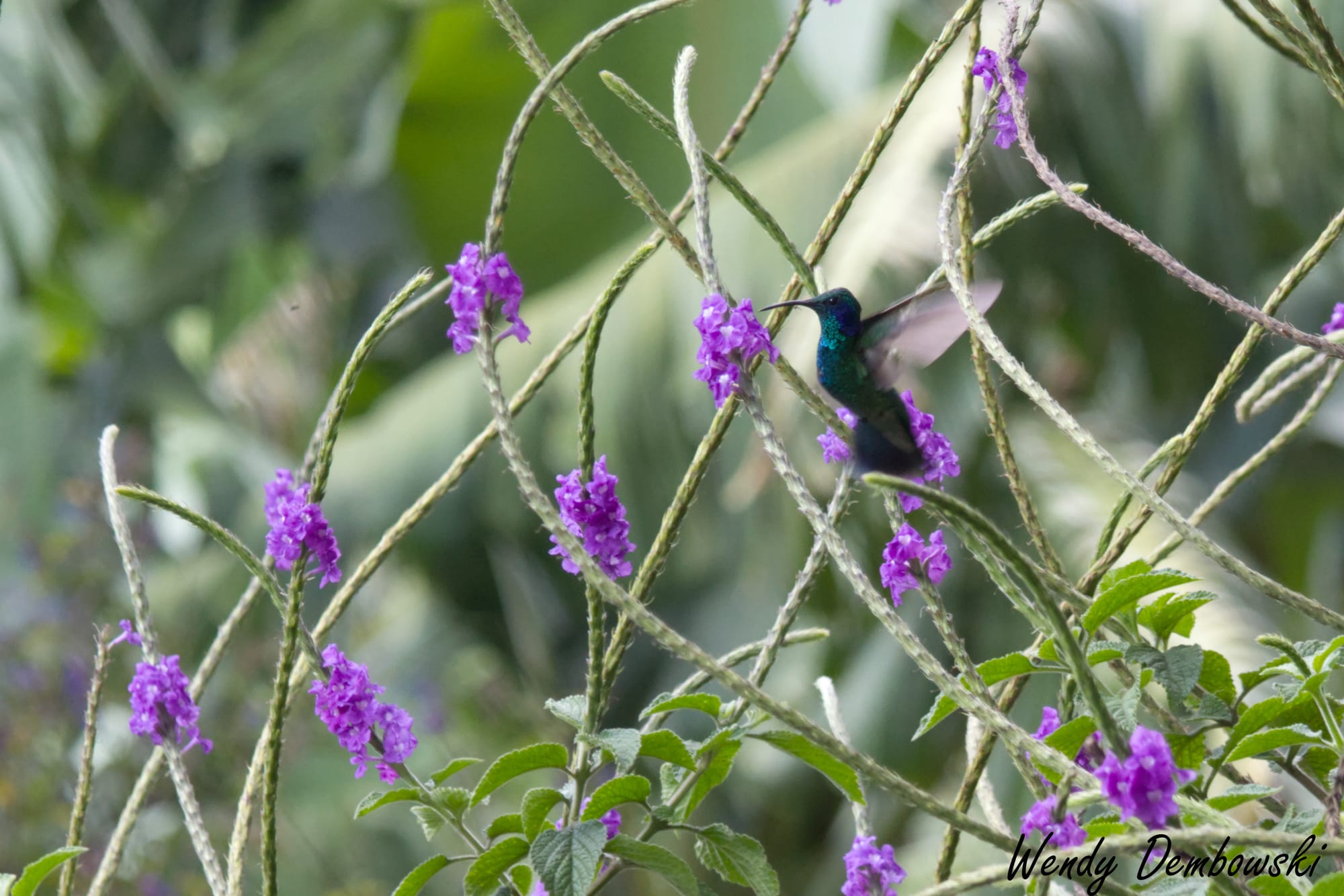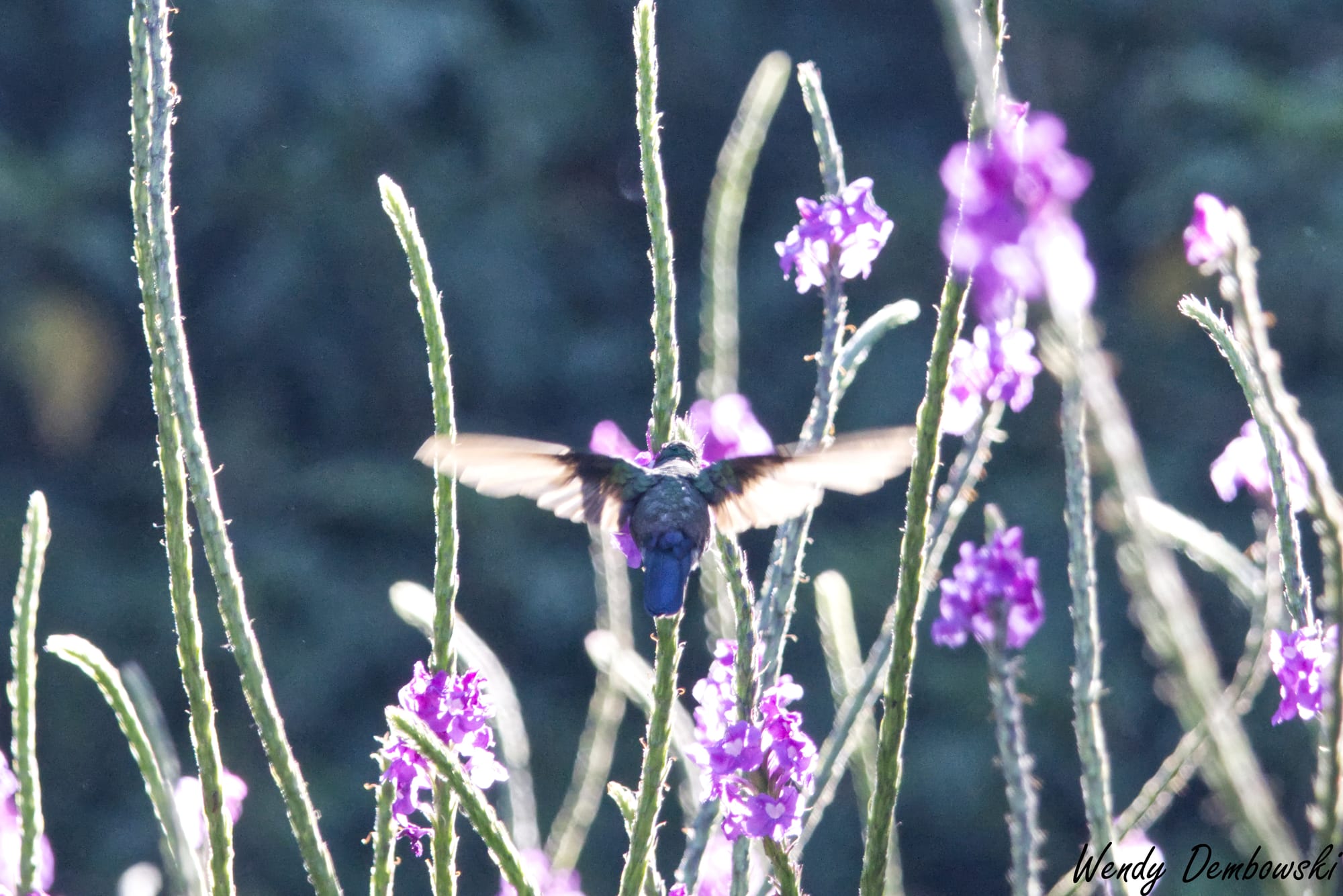 A Violetear Hummingbird hovers amongst some favorite hummingbird flowers