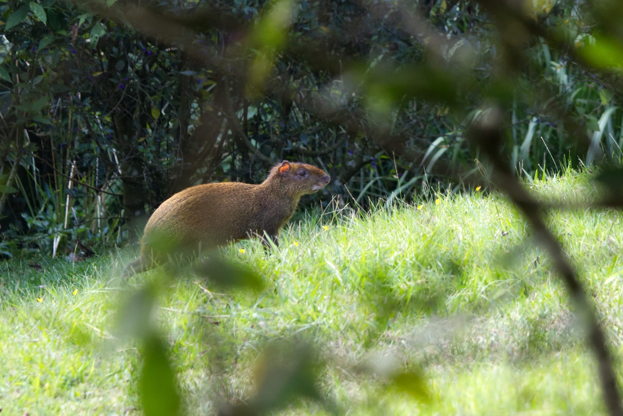 A Lesson's Motmot takes a moment to bask in the setting sunAn agouti poses near some flowersA Stipe-tailed Hummingbird feeds. The Gray-Breasted Wood-wren was a challenge to get photos of. It moved quickly along the ground, often hiding among the leaf debris.A White-Eared Ground Sparrow chills in a bushA Coppery-headed Emerald also enjoys the hummingbird favorites